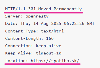 Keď sa váš prehliadač alebo vyhľadávací robot pripája na URL adresu, okrem obsahu, ktorý vidíte aj vy, dostáva aj tzv. HTTP headers. Jedná sa o dáta o URL. Napríklad http://spotibo.sk vráti takúto odpoveď: