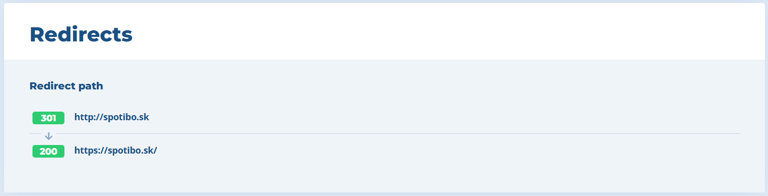 • Nemusíte si všimnúť, že presmerovanie nie je priame, ale vyhľadávač musí navštíviť viacero URL. Napríklad najskôr príde na http://spotibo.sk/stranka, to ho presmeruje na https://spotibo.sk/stranka, to zasa na https://www.spotibo.sk/stranka a to na http://www.spotibo.sk/nova-stranka. Takéto reťazenie zbytočne zdržiava od načítania cieľovej adresy. Zdržanie je minimálne, s jednou URL si vyhľadávač poradí. Praktickým problémom sa to stáva v momente, keď máte takýchto URL vysoké množstvo alebo keď je reťaz pridlhá. Vyhľadávače obvykle nasledujú max. 5 presmerovaní.